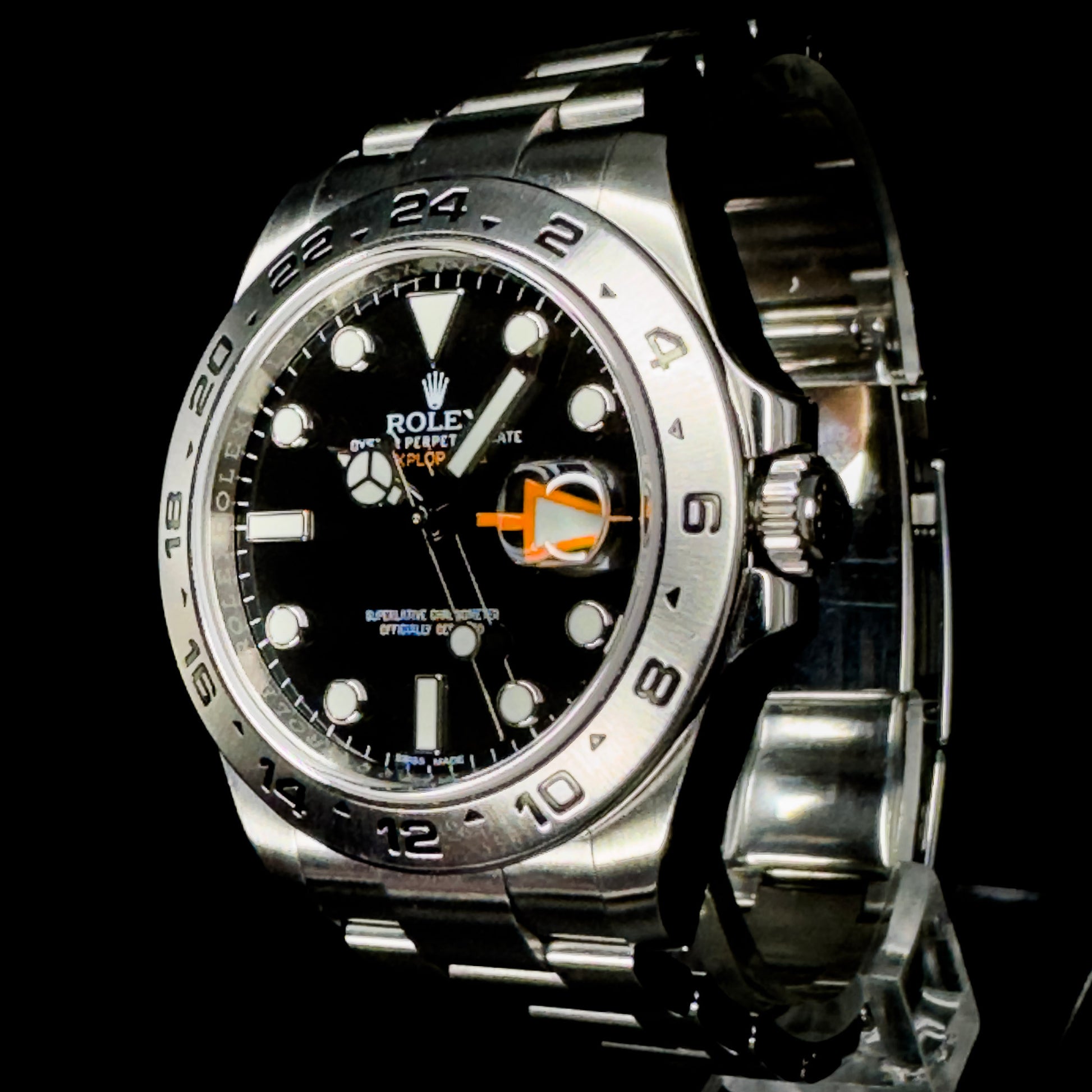 For sale is the Rolex Explorer II 216570 with a sleek black dial. This 42mm stainless steel sports watch features luminous markers, a bold orange 24-hour GMT hand, and a fixed 24-hour bezel—built for adventure and everyday wear.